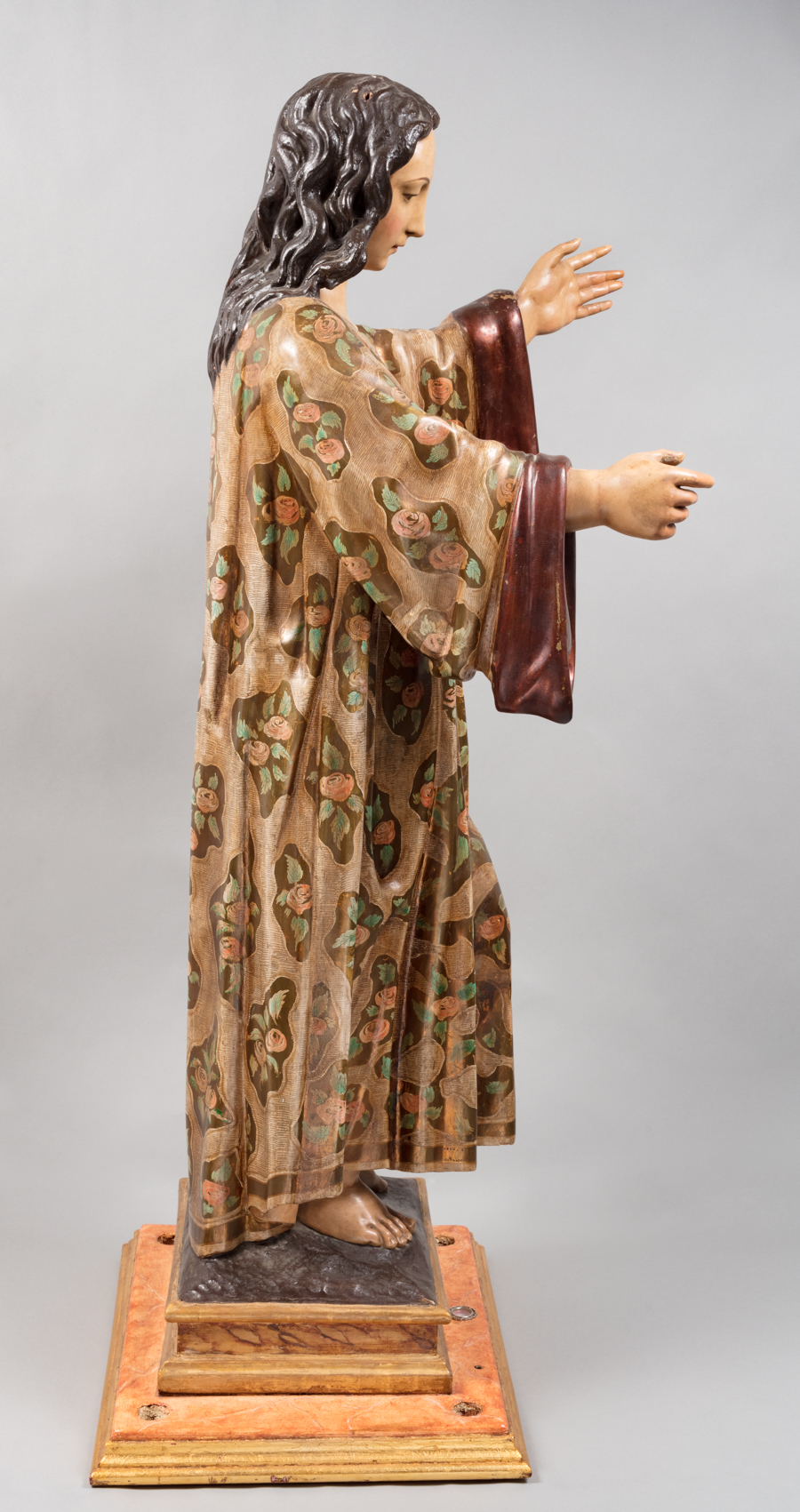 Con todo, y a pesar de este origen dieciochesco de la escultura, sabemos por los estudios científicos llevados a cabo, que la imagen, tal y como ha llegado hasta nosotros, debe de considerarse obra del imaginero Francisco Velasco Barahona, quien en 1965 le sustituyó íntegramente el cuerpo, muy probablemente reproduciéndolo por medio del "sacado de puntos". Sólo la talla de la cabeza y su encarnadura –actualmente oculta- perviven de la escultura barroca. Además, el análisis detallado de las fotografías tomadas en 1948 por José María González-Nandín para la Fototeca del Laboratorio de Arte de la Universidad de Sevilla nos induce a pensar que el cuerpo que lucía dicha imagen (realizada, según algunos, en telas encoladas) era de madera tallada y estofados sus ropajes con la decoración dieciochesca que, al igual que ocurre con la imagen de San José, coincide cronológicamente con la ejecución del retablo que las alberga. Por su parte, y a tenor de la morfología de la cabeza, ésta se nos antoja, incluso, más antigua, por lo que el aspecto dieciochesco podría haber sido fruto de la reforma barroca de una imagen incluso anterior. Sea como fuere, también resulta evidente que la decoración polícroma que actualmente luce la imagen es obra del escultor Velasco Barahona, no sólo por las referencias documentales y la sustitución del cuerpo que le habría de servir de soporte ya citados, sino por cuanto el uso de láminas de oro metal y una torpe ejecución técnica nos revelan su más que segura paternidad.